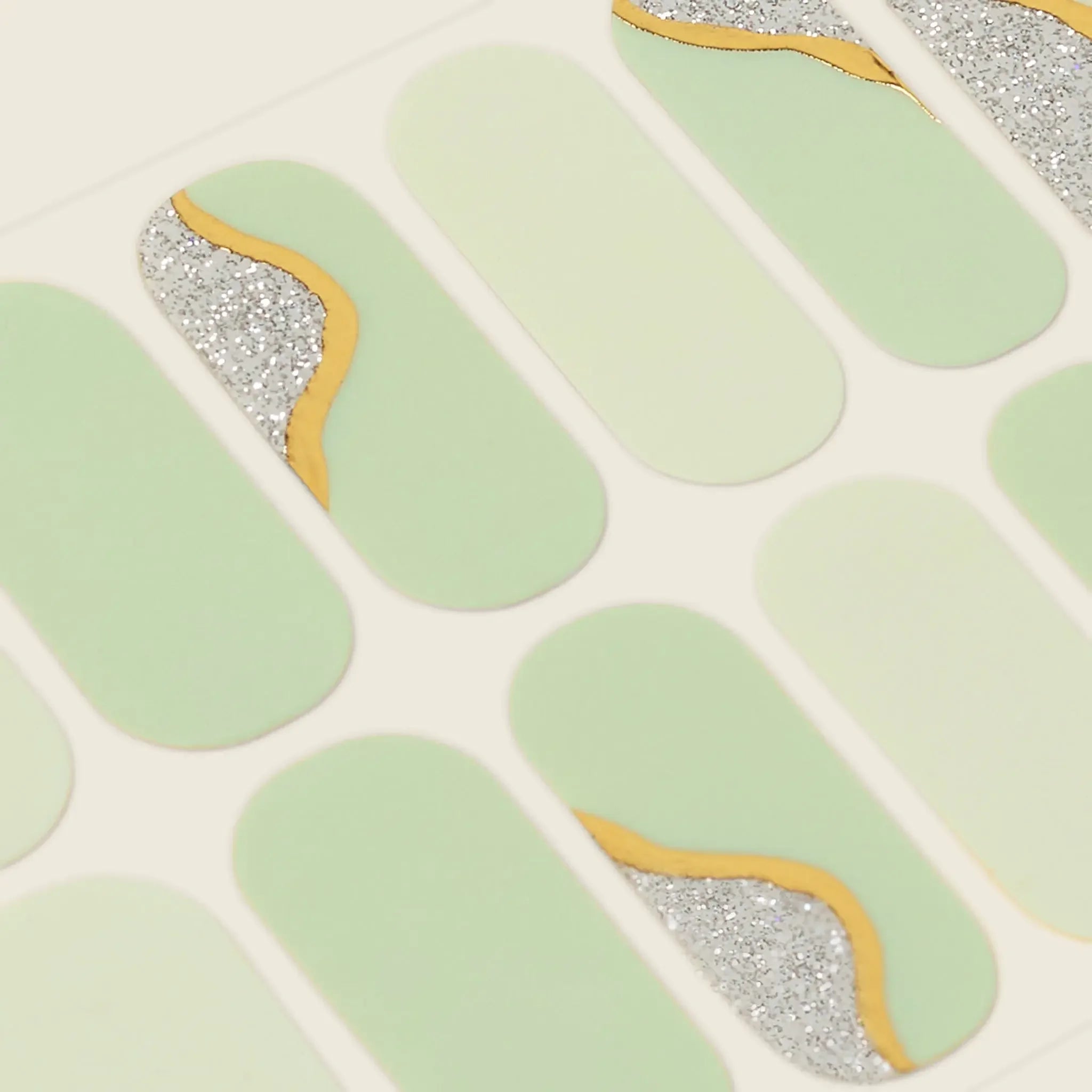 Kim brings a calm sage green base to life with silver glitter and gold detailing — a chic mix of serenity and sparkle. Perfect for when you want understated elegance with a twist.